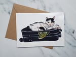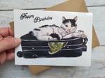 5x7 Greeting card of Sophie, a fluffy black and white cat, sitting on a suitcase.
